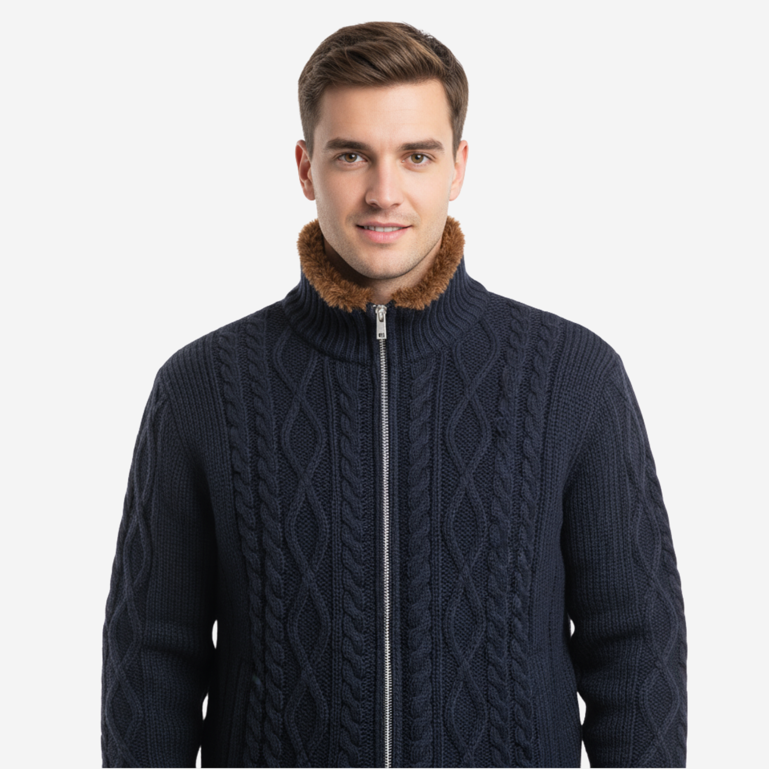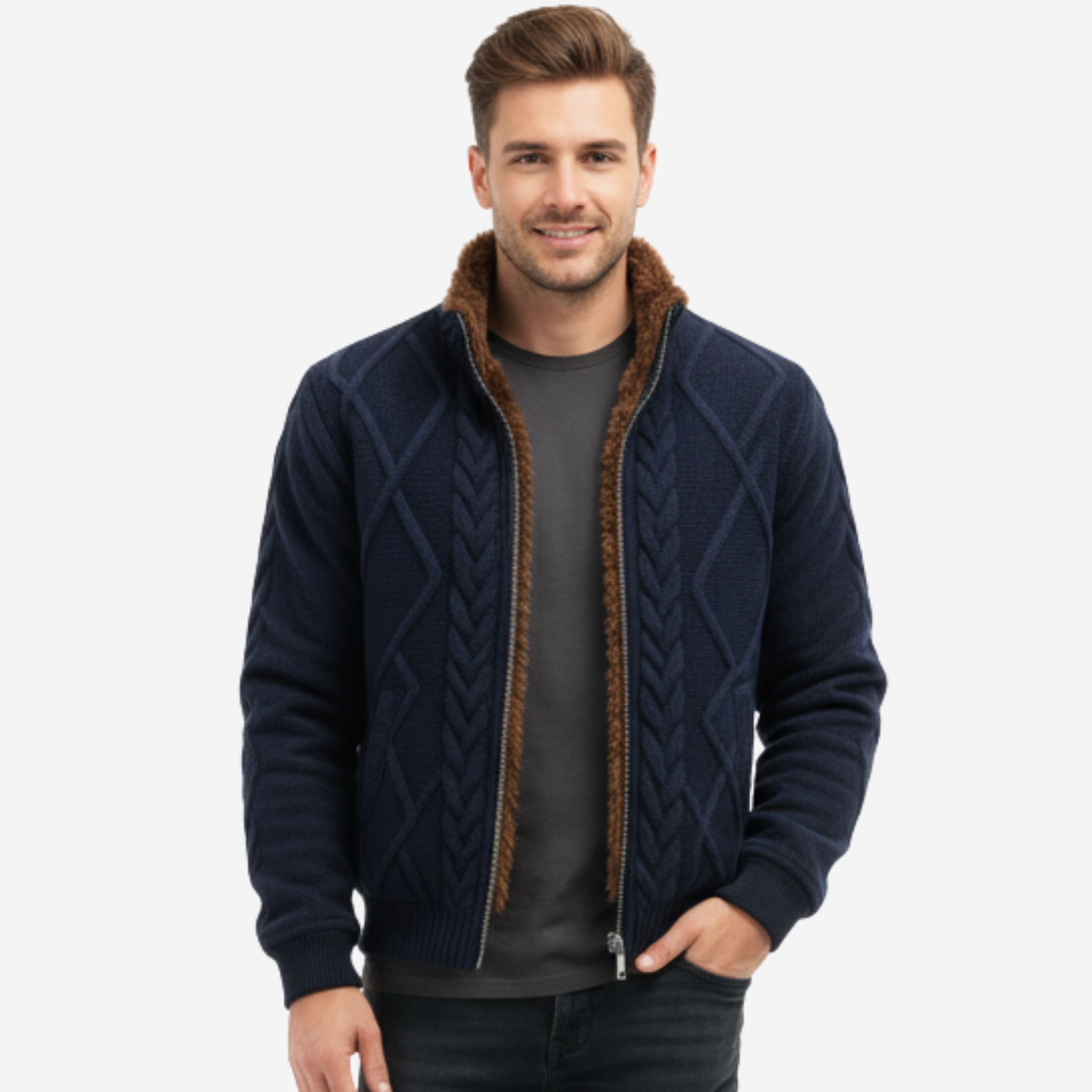 Diese elegante Strickjacke kombiniert klassischen Style mit modernem Komfort und wird zu Ihrem unverzichtbaren Begleiter in der kalten Jahreszeit. Die hochwertige Woll-Mischung mit isolierter Fütterung hält Sie warm, ohne dabei aufzutragen, während das strukturierte Zopfstrick-Design für einen zeitlosen, maskulinen Look sorgt. Perfekt für Büro, Freizeit oder besondere Anlässe - diese Jacke passt zu jedem Stil und jeder Gelegenheit.